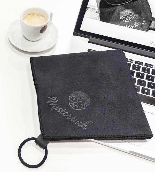 Das weiche, doppellagige Mikrofaser-Material reinigt auch hochsensible Oberflächen schonend und ohne bleibende Schäden. Vorder- und Rückseite des Tuchs sind durch stabile, gekettelte Nähte miteinander verbunden. Der stabile Gummiring dient zum Aufhängen des Tuchs beispielsweise am Stativ, um es direkt und jeder Zeit griffbereit zu haben. Eine Echtleder Schlaufe unterstreicht den hochwertigen Charakter von Mistertuch®.